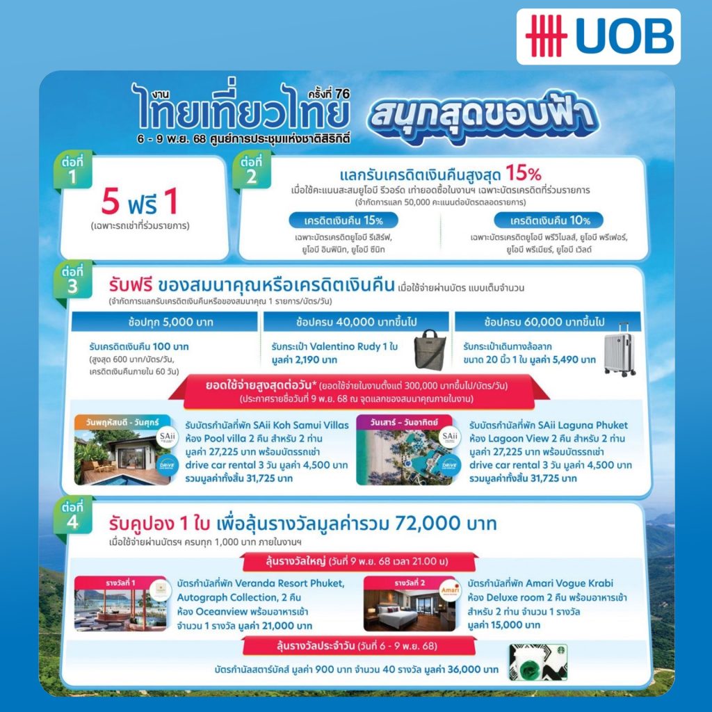 กลับมาอีกครั้งกับงานใหญ่ที่คนรักการท่องเที่ยวรอคอย! “งานไทยเที่ยวไทย ครั้งที่ 76” และ “ไทยเที่ยวนอก ครั้งที่ 5 สนุกสุดขอบฟ้า” ที่รวมแพ็กเกจท่องเที่ยว โรงแรม รีสอร์ต สายการบิน และบริการต่าง ๆ ไว้ในที่เดียว! พิเศษกว่าทุกครั้งคือการรวมทัพโปรโมชั่นบัตรเครดิตจากธนาคารชั้นนำ ทั้ง UOB, CardX, และ Krungsri ที่จัดหนักทั้งส่วนลด เครดิตเงินคืน (Cashback) และของรางวัลมูลค่ารวมเกือบสามแสนบาท!
