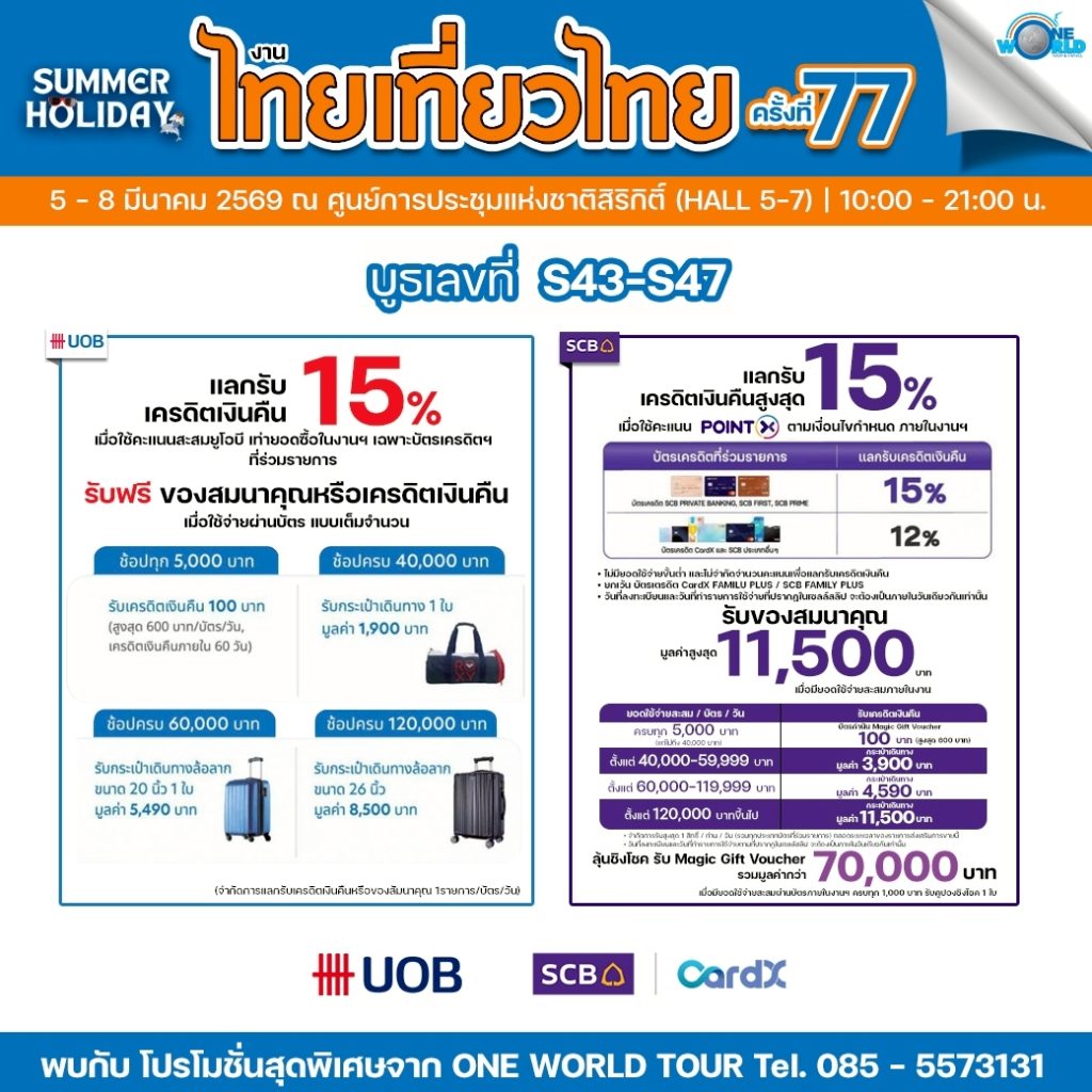 คุ้มกว่าใครเมื่อชำระผ่านบัตรเครดิตที่ร่วมรายการภายในบูธ One World Tour & Travel (S43-S47) รับสิทธิประโยชน์ 2 ต่อ ทั้งเครดิตเงินคืนและของสมนาคุณสุดพรีเมียม!