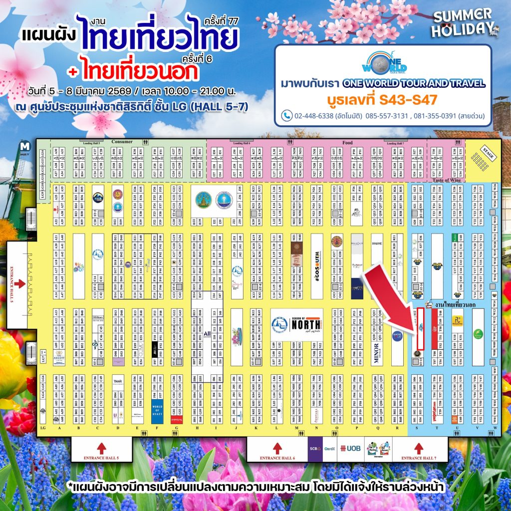 One World Tour & Travel จัดหนักจัดเต็ม ขนโปรแกรมทัวร์มาเอาใจนักเดินทางที่บูธ S43 – S47 (Hall 5-7 ชั้น LG) ไม่ว่าคุณจะฝันอยากไปดูดอกไม้เปลี่ยนสีที่เนเธอร์แลนด์ หรือทริปซัมเมอร์ที่ยุโรป เรามีครบ!